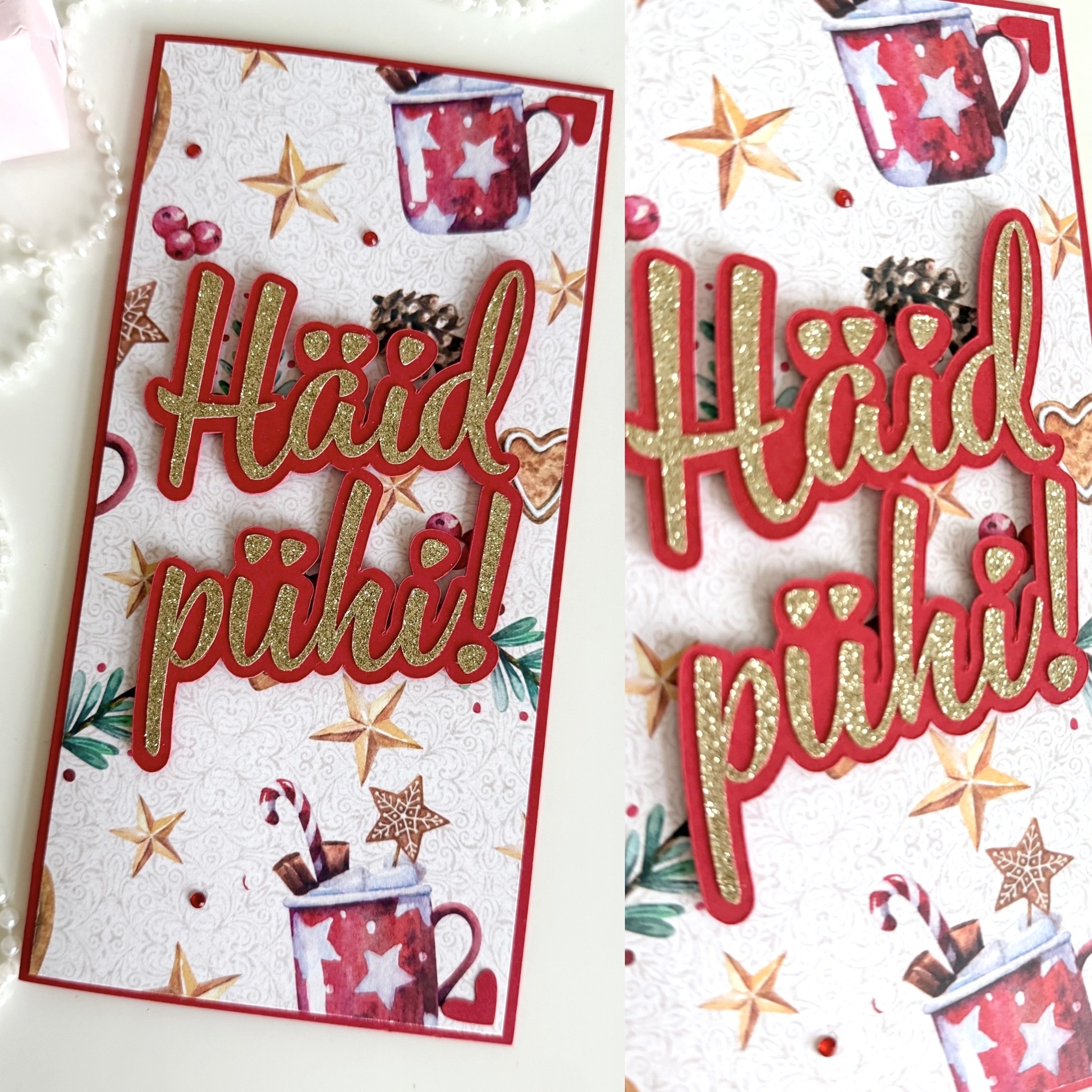 Häid jõule! käsitöökaart on jõulu värvides, pühalikult särav kaart, Kaardil on rohkelt erinevaid detaile, lillelehti, kuuseoksi ja pärleid. Jõuluteemaline disainpaber, mida taustaks on kasutatud, on samuti malbetes toonides. Kaardile on lisatud kartongist 3D efektiga detail kirjaga häid pühi! Kaart on 3D efektiga aga mahub ümbrikusse ja on sobilik postiga saatmiseks. Kaardi toorik on jõulupunast tooni.