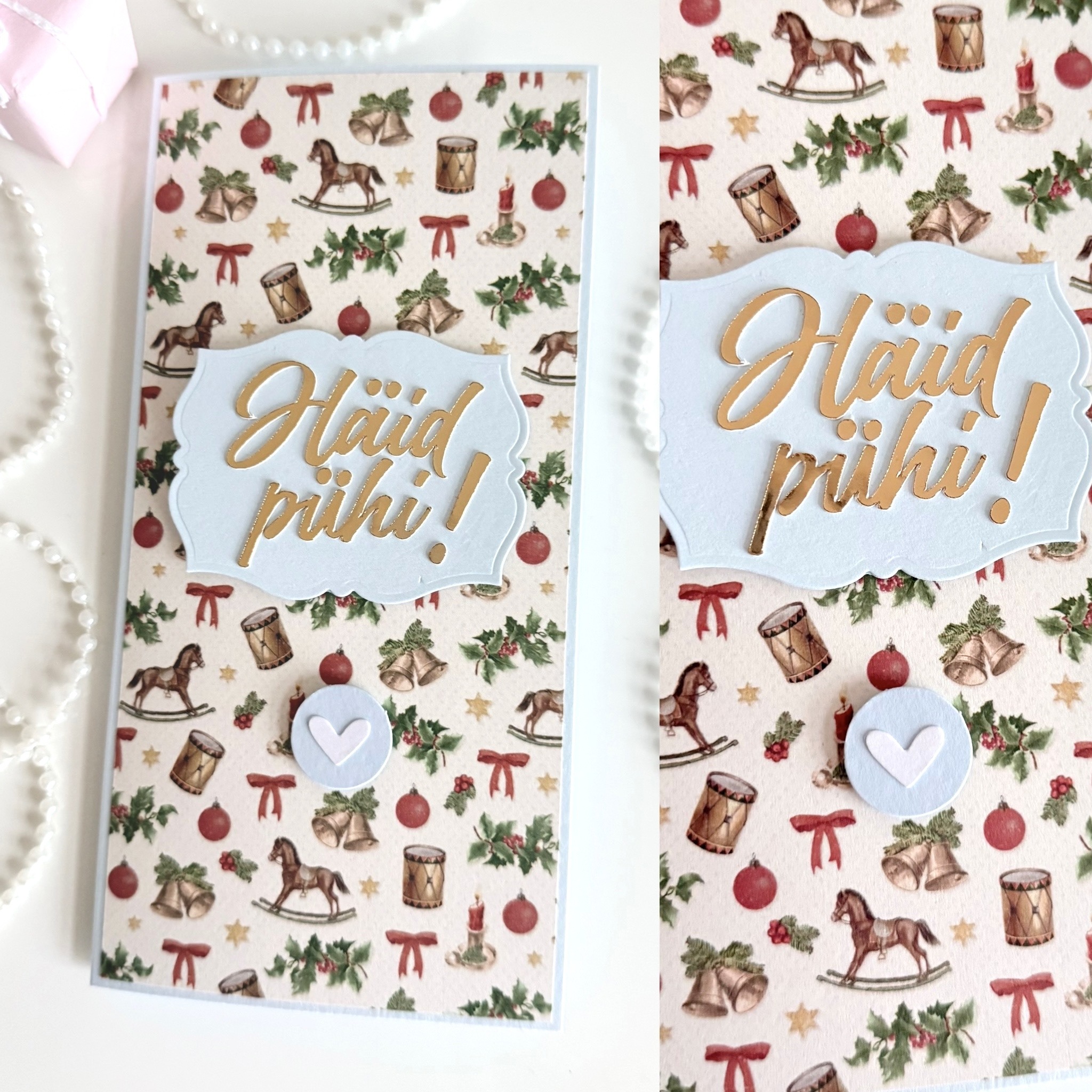 Jõulukaart on jõulu värvides käsitöökaart, valmiststaud Eestis käsitööna, pühalikult särav kaart. Jõuluteemaline disainpaber, mida taustaks on kasutatud, on samuti malbetes toonides. Kaardile on lisatud kartongist 3D efektiga detail kirjaga häid pühi! Kaart on 3D efektiga aga mahub ümbrikusse ja on sobilik postiga saatmiseks. Kaardi toorik on jõulupunast tooni.
