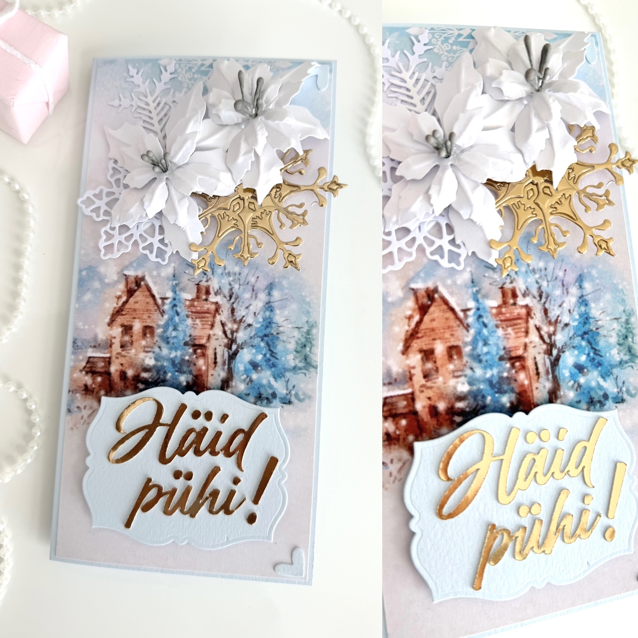 Jõulukaart jõulutähtedega on pastelsetes toonides, suurte jõulutähtedega, pühalikult särav kaart ja see jõulukaart on eriti rohkete detailidega, kaunistatud käsitööna valminud metalselt säravate valgete jõulutähtede õitega, mille keskel käsitööna valminud tolmukad. Kaardil on rohkelt erinevaid detaile, lillelehti, kuuseoksi ja pärleid. Jõuluteemaline disainpaber, mida taustaks on kasutatud, on samuti malbetes toonides. Kaardile on lisatud rohkelt valgeid ja säravaid detaile ja metalset sära, ning kartongist 3D efektiga detail kirjaga häid pühi! Kaart on 3D efektiga ja suhteliselt kõrge. Kaardi toorik on säravast metallik kartongist.