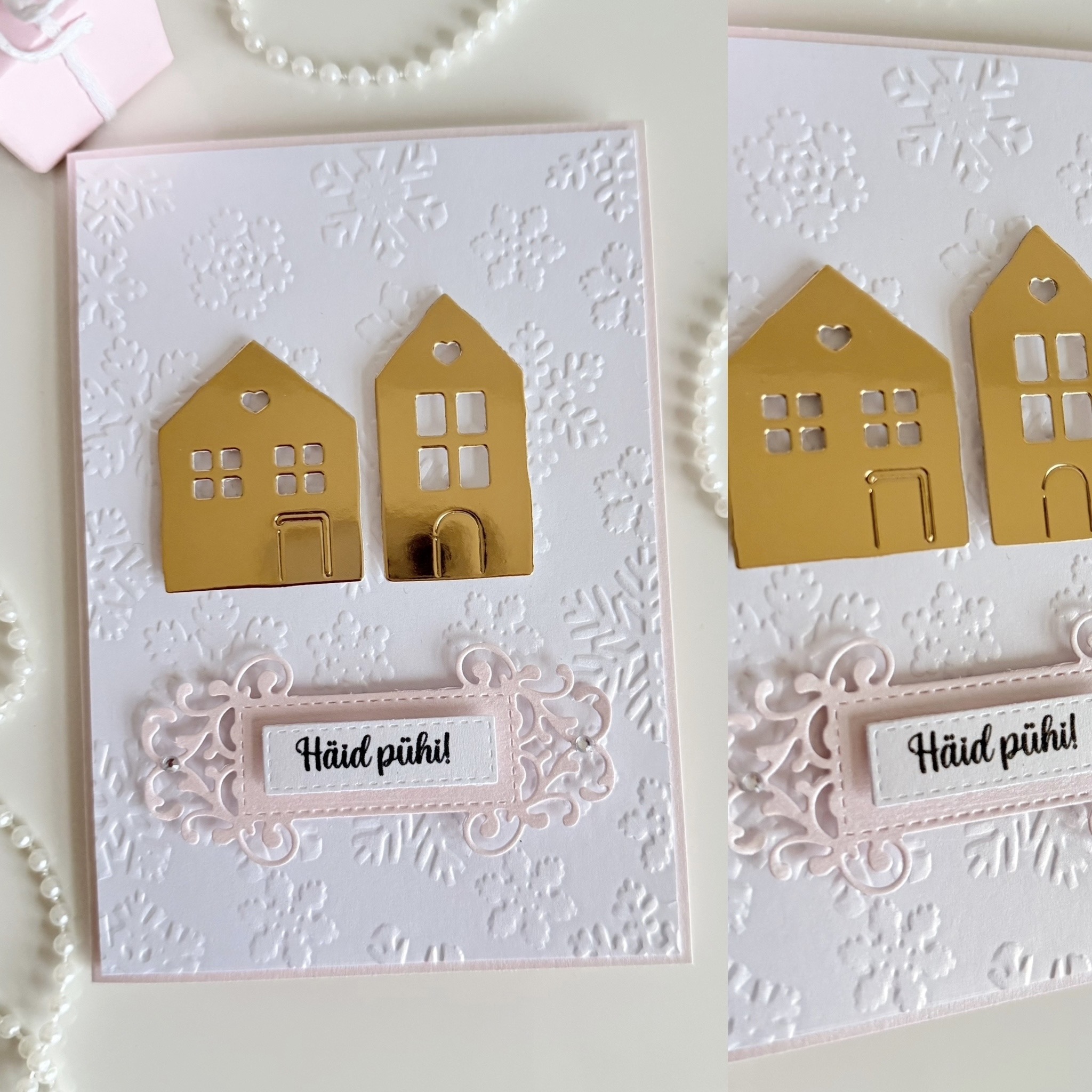 Käsitöö jõulukaart Häid pühi! on pastelsetes toonides, suurte käsitööna valminud jõulutähtedega, pühalikult särav kaart ja see jõulukaart on eriti rohkete detailidega, kaunistatud käsitööna valminud metalselt säravate jõulutähtede õitega, mille keskel käsitööna valminud tolmukad. Kaardil on rohkelt erinevaid detaile, lillelehti, kuuseoksi ja pärleid. Jõuluteemaline disainpaber, mida taustaks on kasutatud, on samuti malbetes toonides. Kaardile on lisatud rohkelt valgeid ja säravaid detaile ja metalset sära, ning kartongist 3D efektiga detail kirjaga häid pühi! Kaart on 3D efektiga ja suhteliselt kõrge. Kaardi toorik on säravast metallik kartongist.