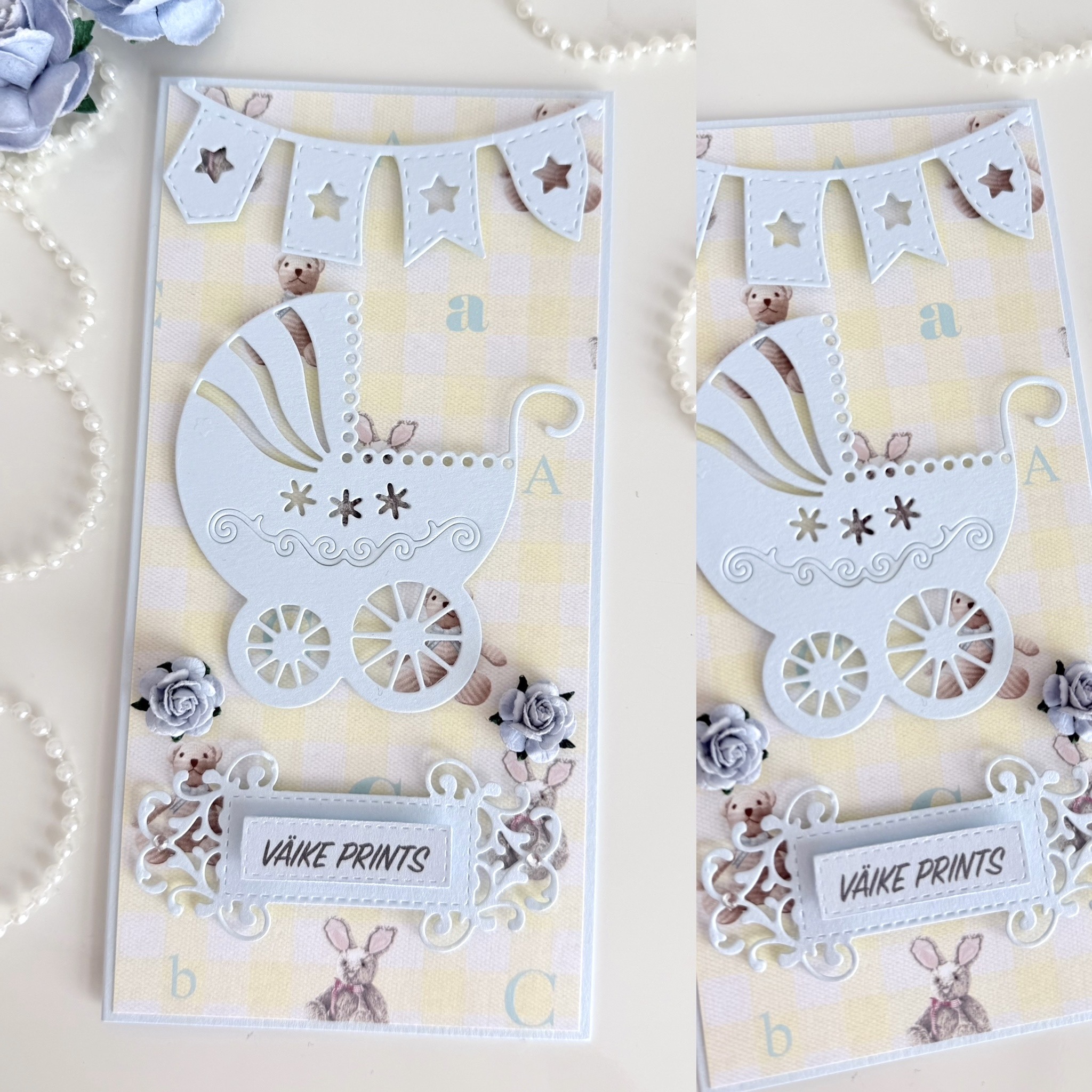Antud kaart katsikule on sobilik kingitus pisikesele beebile ning tema emale ja isale tema sündimise puhul. Kahepoolne kaart on metalse helesinist tooni 300g/m² kartongist. Kaunistuseks on kaardile lisatud beebivanker, lipukett ja tekst beebi sünniandmetega.