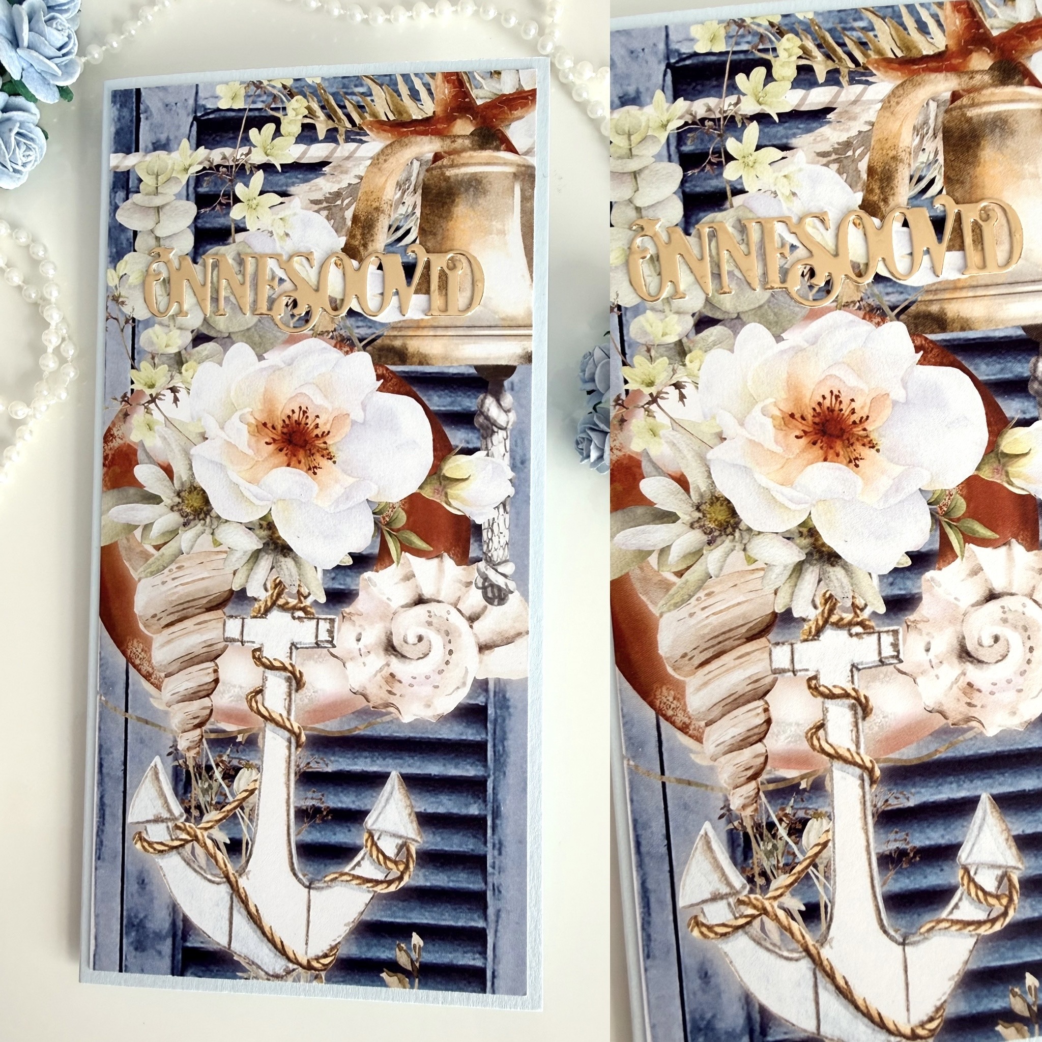 See mereteemaline õnnitluskaart sünnipäevaks on sinistes toonides, rohkete paberist ja foamiranist lillede ning säravate pärlitega. Soovi korral saab lisada vanuse kaardile ja ka sünnipäeva lapse nime. Anna meile oma sellekohasest soovist tellides teada.