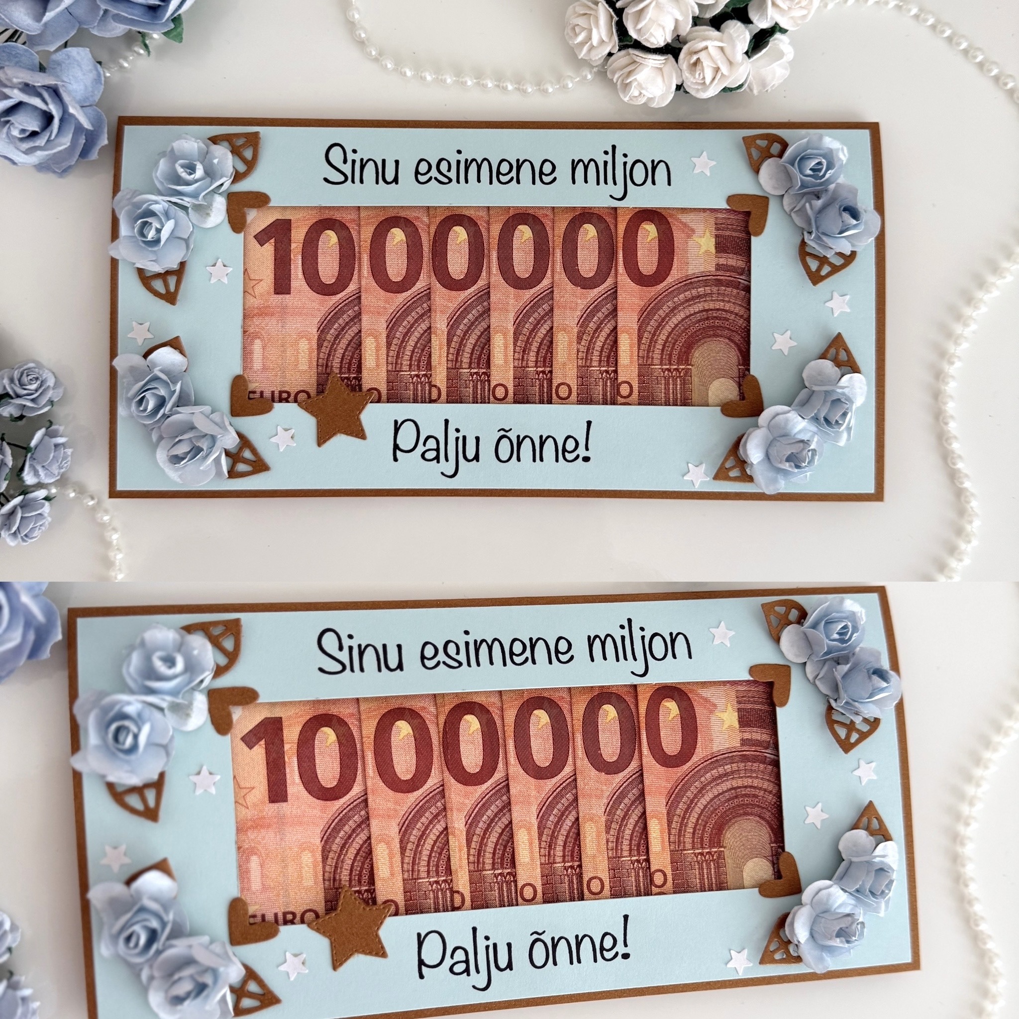 See käsitöökaart on pastelsetes toonides tugeval navy tooni kaarditoorikul, Kaunistuseks on kaardil kvaliteetsed lilled, ning efektne kiri Sinu esimene miljon ja palju õnne!