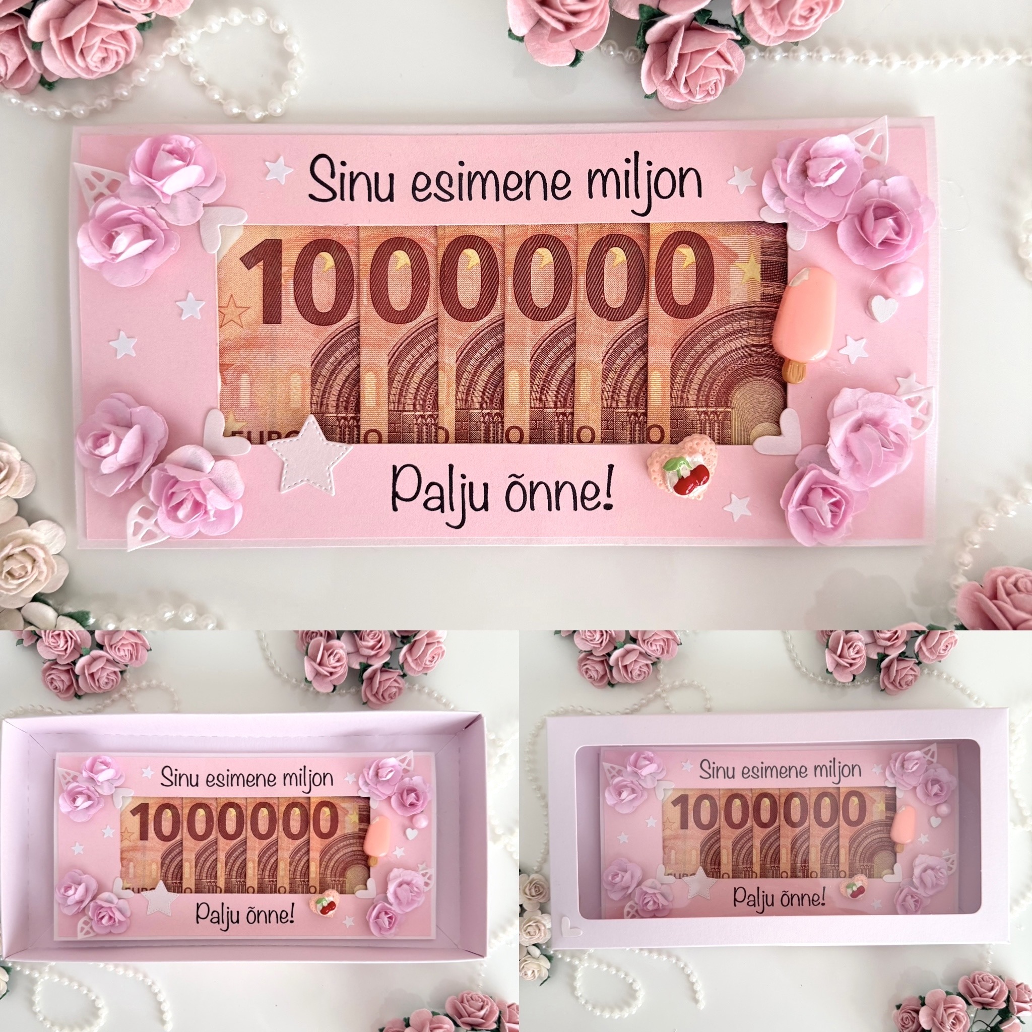 Miljonikaartprintsessile on natuke naljakas, mis seal salata. Kui sa soovid kinkida miljonit tüdrukule, kellel on huumorisoon, siis on see kaart just sulle ja talle 😉 Rahakaart on heleroosat värvi toorikul, heleroosa pastelses toonis kattepaberiga, pisikeste roosade lilledega ning mahutab kuus 10-ne eurost rahatähte.