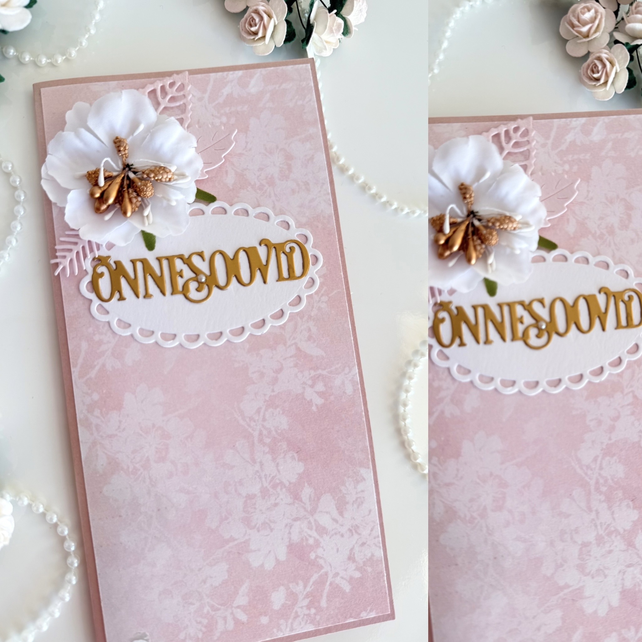 See õnnitluskaart õnnesoovid on pastelsetes toonides, suure vaöge foamiranist lille ja pisikeste heleroosade ja helesiniste detailidega, paberist ja foamiranist lillede ning puidust südametega kaart. See kaart on küljelt paelaga seotav.