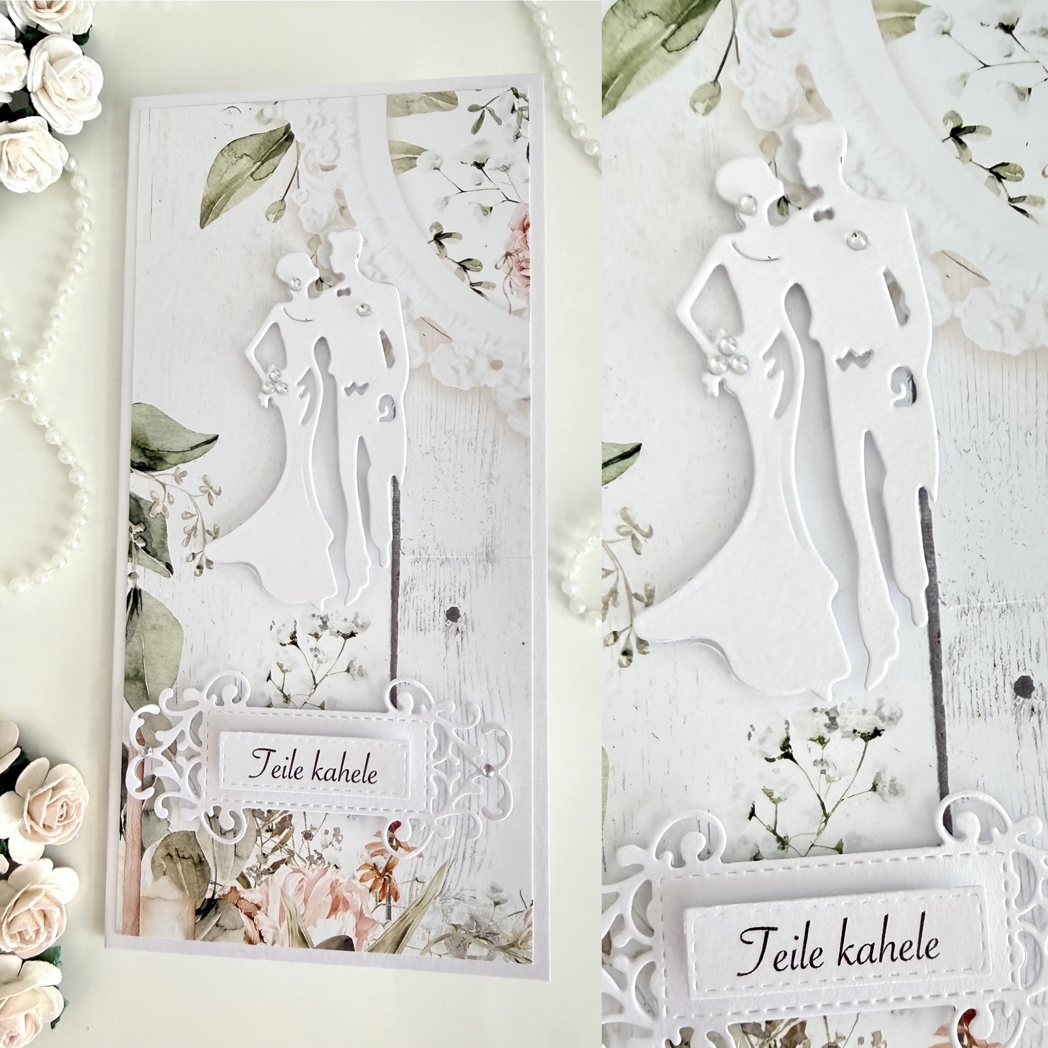 Kaardi mõõt kokkumurtult 9,5cm x19 cm. Pulmakaart on pakendatud kaitsvasse tsellofaanist kilekotti.