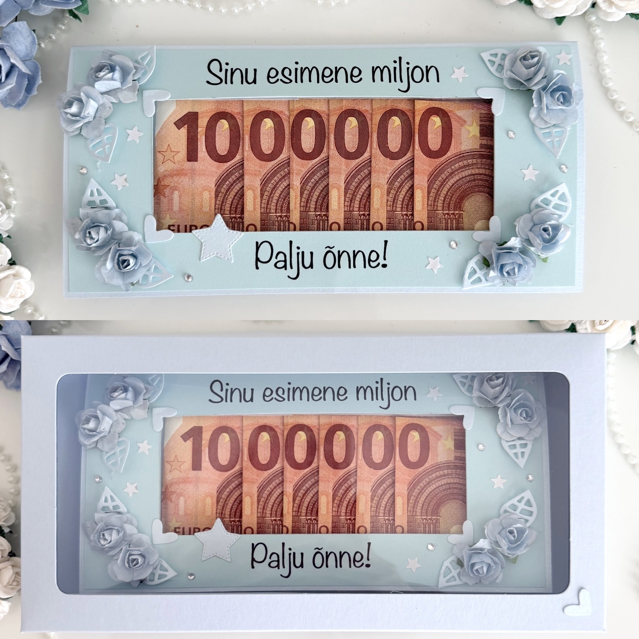 Humoorikas sünnipäevakaart on lahe rahakaart, sest kes siis ei sooviks saada kingiks miljonit 😉 Rahakaart on heledates pastelsetes toonides, pisikeste paberist rohkete lilledega ning mahutab kuus 10-ne eurost rahatähte ehk siis miljoni 🙂
