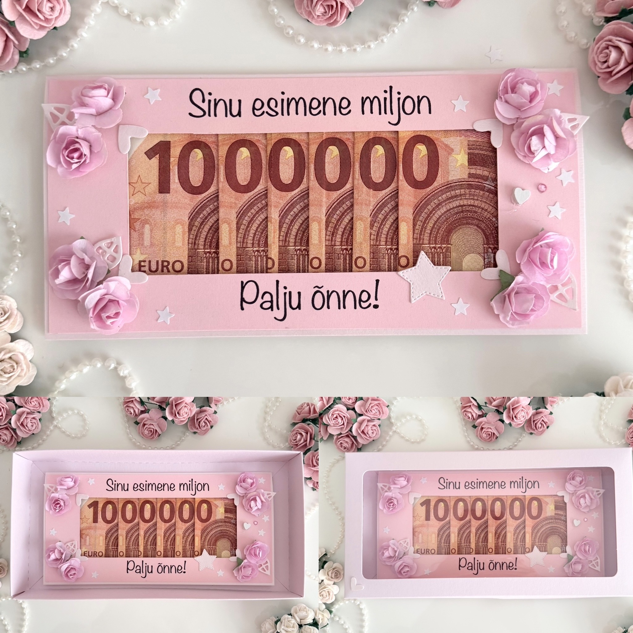 See käsitöökaart on pastelsetes roosades toonides tugeval heleroosal toorikul, Kaunistuseks on kaardil kvaliteetsed paberist uhked lilled, ning efektne kiri Sinu esimene miljon ja Palju õnne!