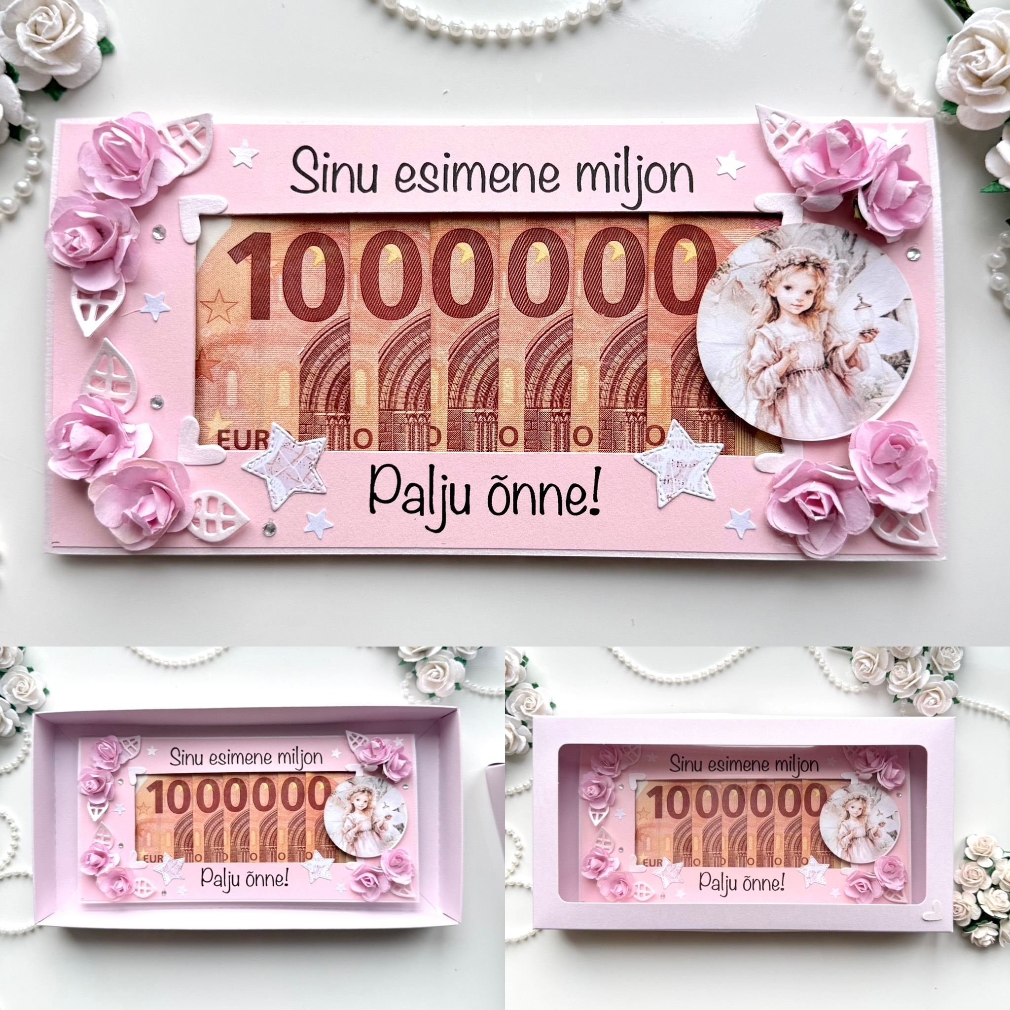 Sinu esimene miljon, on imehea kingitus, kui sa soovid kinkida miljonit 😉 Rahakaart on heledates pastelsetes toonides, pisikeste paberistt lilledega ning mahutab kuus 10-ne eurost.